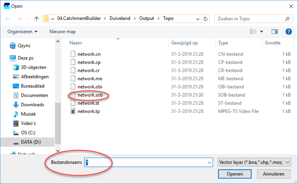 - Let op: het bestandstype wat we willen importeren heet .sob. Dit wordt echter niet standaard herkend door de File Browser in SOBEK. Typ daarom in het selectievak * gevolgd door <Enter>. Dan zal het bestand network.sob zichtbaar worden.