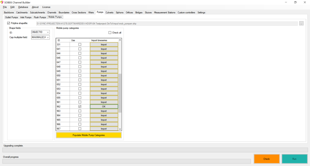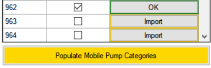 Wanneer het ID-veld is geselecteerd, kan de lijst met unieke pomp-ID’s worden samengesteld door op <Populate Mobile Pump Categories> te klikken. Naast ieder ID verschijnt een knop getiteld <Import>. Door daarop te klikken kan de gebruiker de noodbemaling voor de onderhavige pomp importeren uit een tekstbestand.