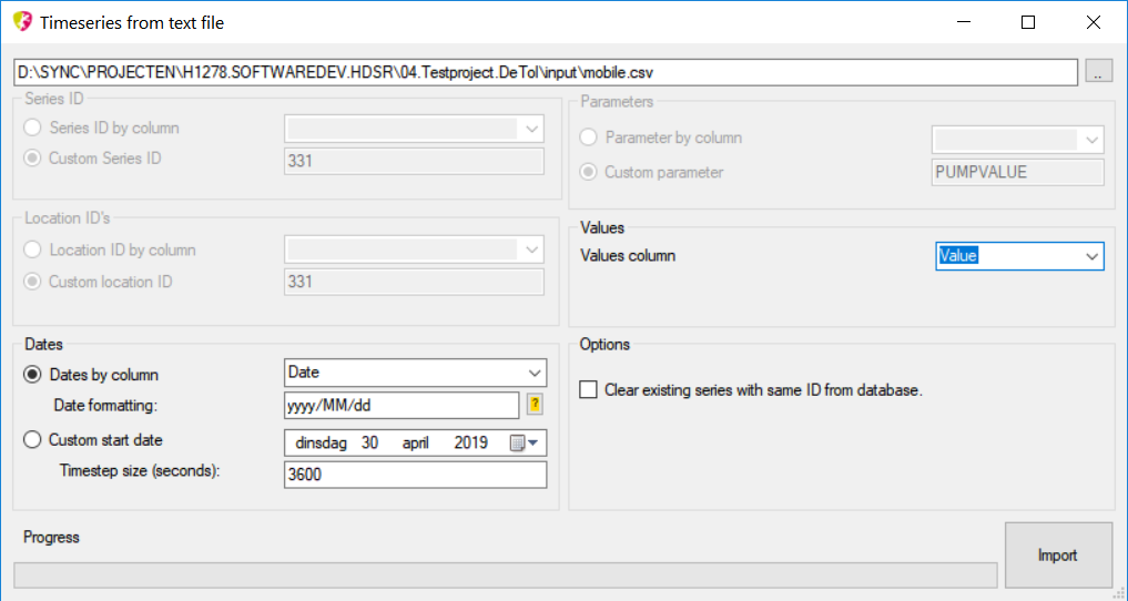 Bij het importeren verschijnt het generieke formulier voor de import van tijdreeksen uit een tekstbestand.
