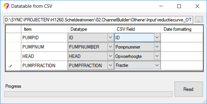 - Geef in de kolom ‘CSV Field’ aan in welk veld van het CSV-bestand respectievelijk het ID van het gemaal, het pompnumer, de opvoerhoogte en de pompreductiefractie staan.