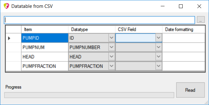 Er verschijnt een nieuw formulier. Hier kunt u een csv-bestand selecteren en aangeven in welke kolommen resp. het ID, pompnummer, de opvoerhoogte en capaciteitsfractie staan.