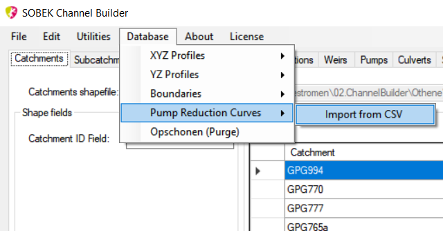 - Kies uit het menu “Database” de optie “Pump Reduction Curves” – “Import from CSV”.