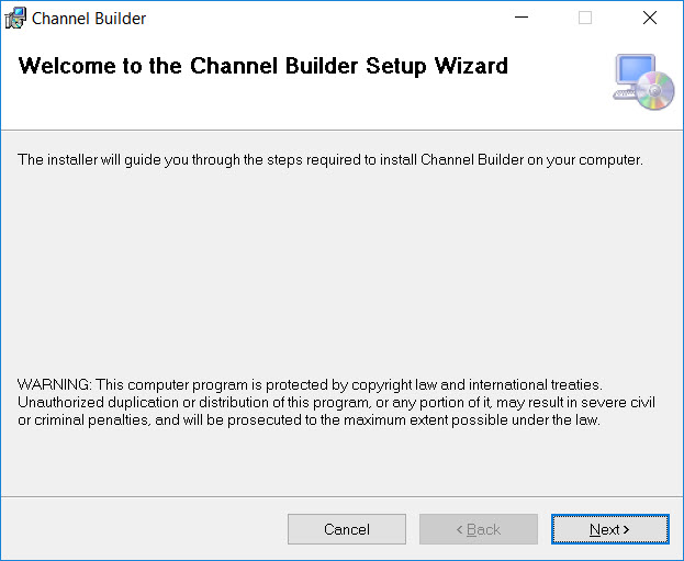 U ontvang van ons een zip-file met daarin twee bestanden: ChannelBuilderSetup.msi en Setup.exe. Beide bestanden moeten worden uitgepakt en samen in één directory geplaatst om ze te kunnen gebruiken. Daarna kan een van beide bestanden worden gedubbelklikt om het installatieproces te starten. Het welkomstscherm verschijnt.