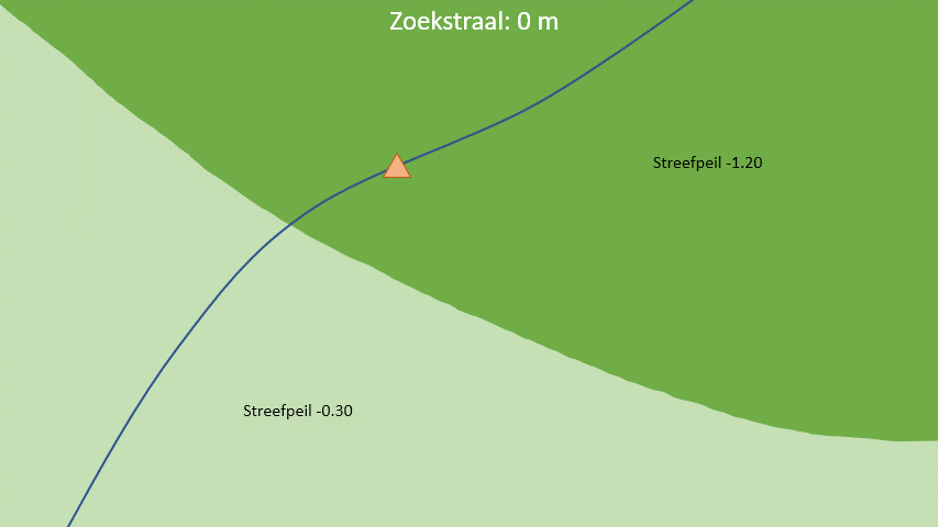 Wanneer er géén eigen streefpeil is opgegeven voor het betreffende kunstwerk zal Channel Builder zelfstandig zoeken in de onderliggende peilgebiedenkaart naar de omringende streefpeilen. Dit zoeken gaat als volgt: