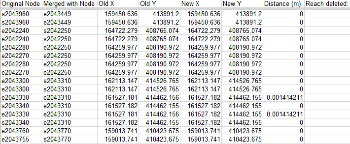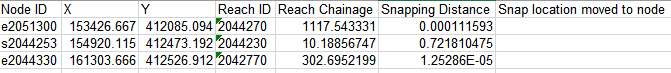 Channel Builder publiceert het resultaat van dit ‘snapping’-proces naar de Logfile.xlsx, tabblad “SnappedReachNodes”. Hierin staat ook de afstand waarover knopen moesten worden verplaatst om ze te kunnen koppelen aan de buurtak.