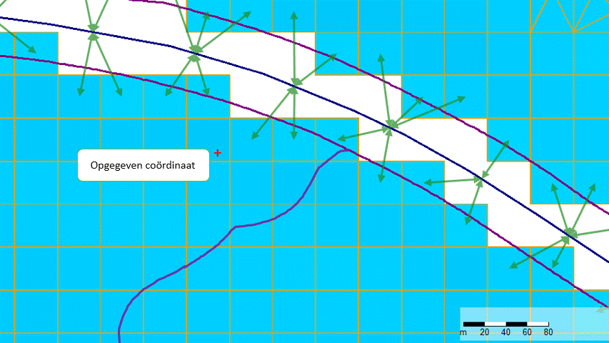 - Vanuit het opgegeven coördinaat zoekt het programma naar de dichtstbijzijnde 2D-cel met 1D2D-link