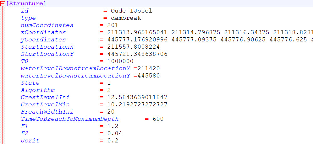 Het resultaat van de bewerking wordt door HydroToolbox weggeschreven in een los bestandje en bevat uitsluitend het benodigde record voor structures.ini. De gebruiker moet zelf dit record nog toevoegen aan structures.ini om de bres toe te voegen aan de modelschematisatie.