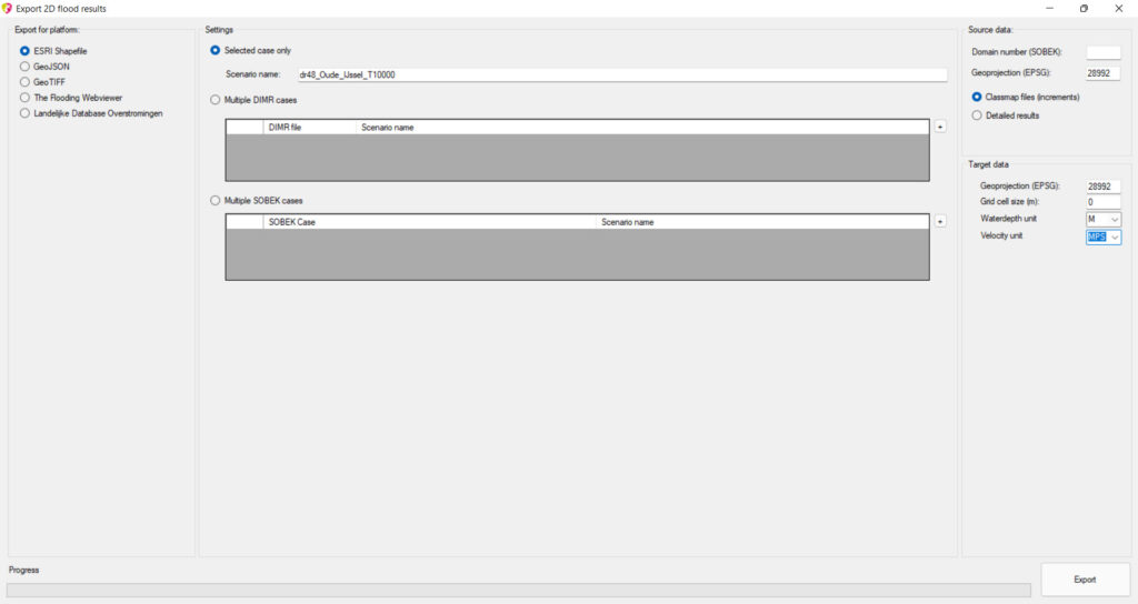 Daarom heeft HydroToolbox een export-functionaliteit waarbij de essentiële aspecten van een overstromingsscenario worden geëxporteerd naar bijv. een Shapefile. Denk hierbij aan: